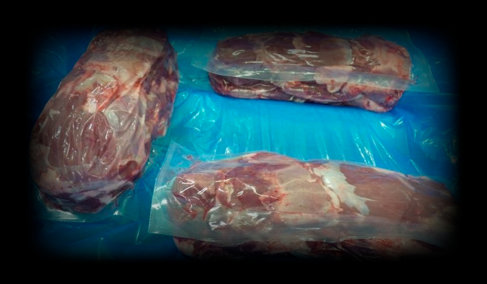 Piezas de carne de vacuno envasadas al vacío, colocadas sobre una superficie protectora azul. El envasado al vacío es una técnica que elimina el aire del interior de la bolsa, sellándola herméticamente para prolongar la vida útil del producto y preservar sus características organolépticas.